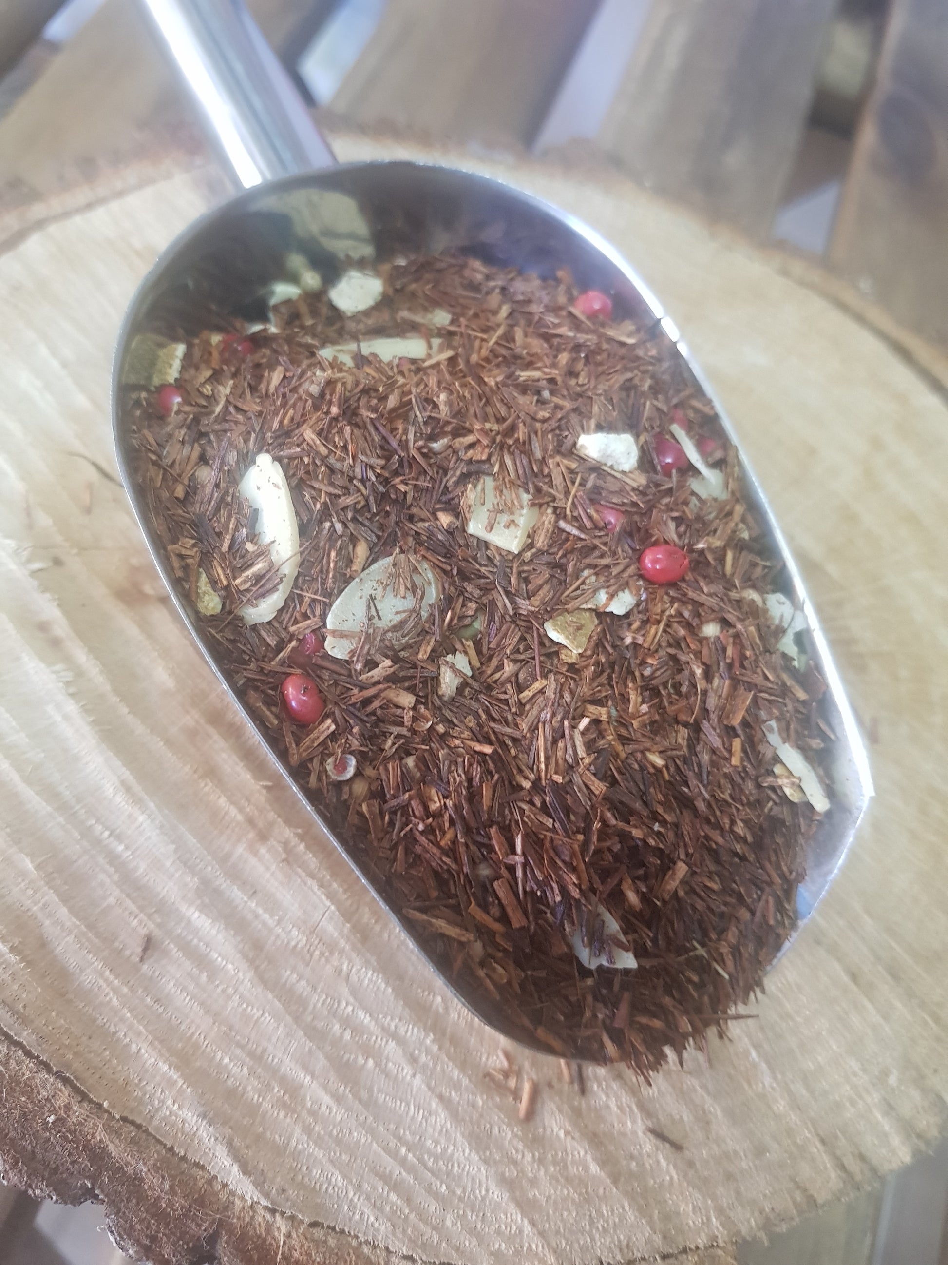 Rooibos elaborado con trozos de almendras, pistachos,cáscara de naranja, cilantro y pimienta rosa.